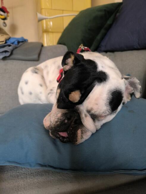 Sunia buldog angielski rok w marcu . Szukamy domu z ogrodem dla naszej suni . Może być z innym buldogiem . Biało czarna . ...